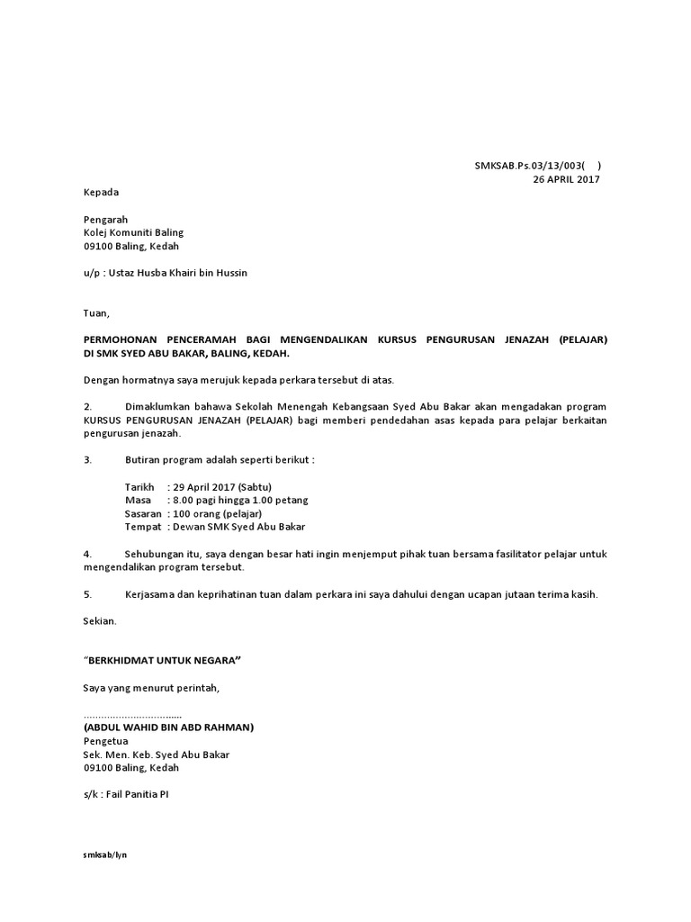 Surat Jemputan Penceramah Kursus Pengurusan Jenazah Smksab 2017 Pdf